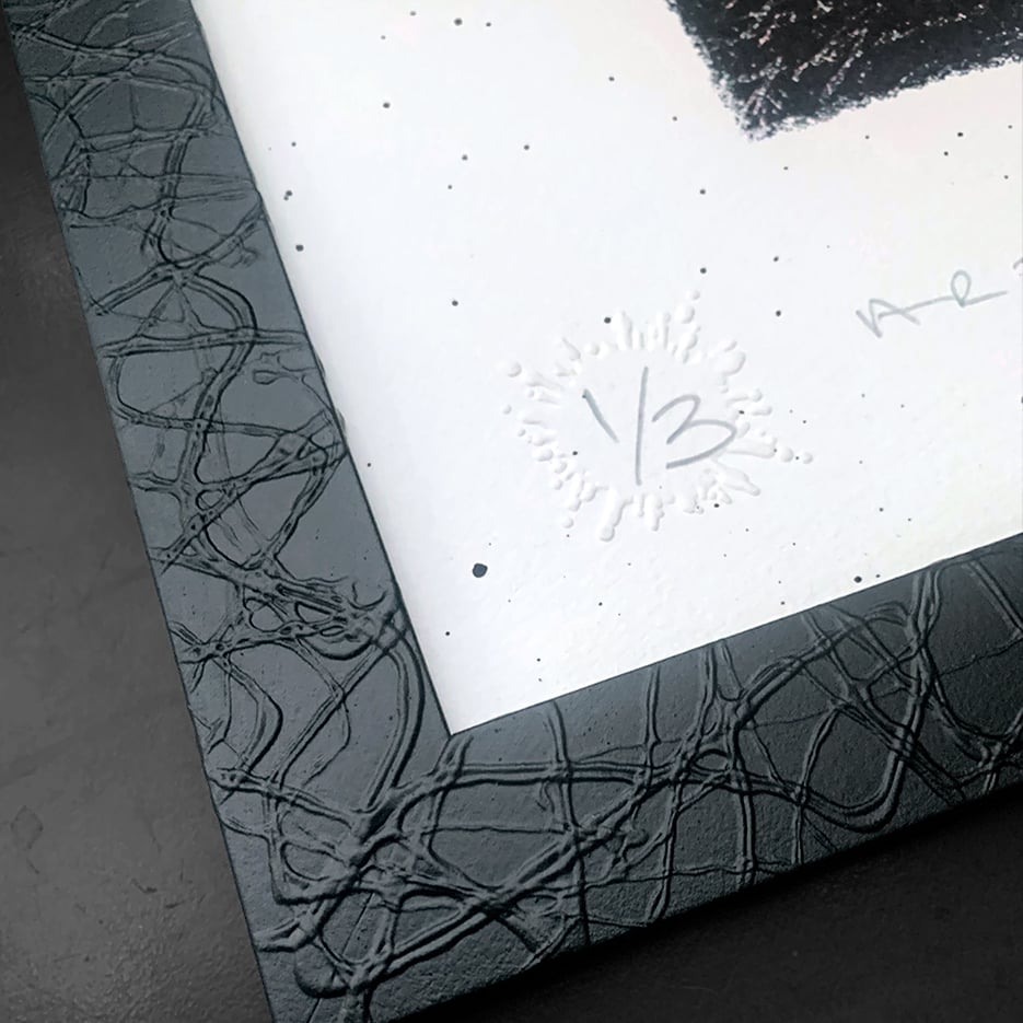 DESCRIPTION: 3 colour hand pulled silk screen on 350gsm art paper supplied in hand dripped frame - signed/stencilled + numbered on backboard.
