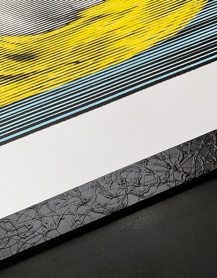 DESCRIPTION: 1 colour hand pulled silk screen with hand painted/coloured blue, yellow and red background on 310gsm off-white art paper - signed/stamped/numbered by Artist